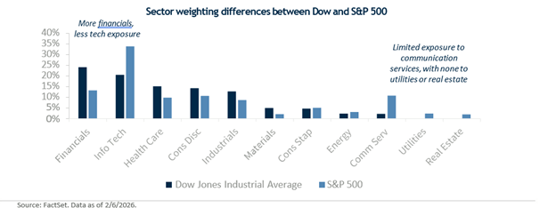- The Dow is price-weighted, so companies with higher share prices exert more influence, regardless of size. As a result, a stock like Goldman Sachs can carry more weight than Nvidia simply because its share price is higher, even though Nvidia’s total market value may be much larger.
